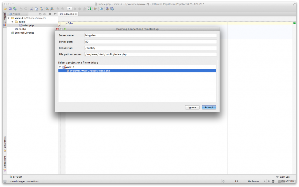 Once set, we can go back to the browser and refresh. This will trigger XDebug in connecting to our PHPStorm IDE, and it will trigger on the breakpoint. If it’s the first incoming connection, PHPStorm might ask for some info: